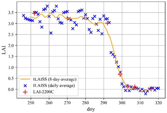 The last step of post-processing is the calculation of the LAI daily average, which compensates the high frequency noise that is caused, for example, by the wind. Additionally, to the daily mean, we applied a simple moving average filter (SMA) such as that suggested in [] with a sliding window size of eight days.