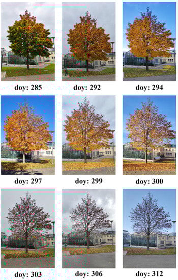 The photos were taken on different days of the measurement campaign from the same position in a southerly direction. The photo series starts after the first leaf discoloration and ends at the time of complete leaf loss. In the time period between the beginning of the campaign on doy 246 and doy 280, an average constant LAI of 3.3 can be observed. From doy 280 on, a small decrease of the LAI was observed. This could be attributed to the drop of the seeds of the maple tree.