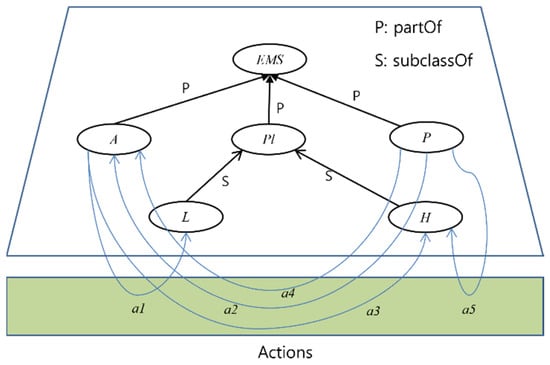 The Active ontology of the Smart EMS System Domain is shown in Figure 5. The figure shows Smart EMS System Domain (EMS), Ambulance (A), Patient (P), Place (PL), Location (L), and Hospital (H) as classes or subclasses, and a1~a5 as interactions among classes and subclasses. The notions of the classes and their interactions are as follow: