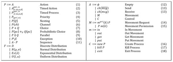 - Feng, C.; Hillston, J. PALOMA: A process algebra for located markovian agents. In Proceedings of the International Conference on Quantitative Evaluation of Systems, Florence, Italy, 8–10 September 2014; Springer: Cham, Switzerland, 2014; pp. 265–280. [Google Scholar] [CrossRef]