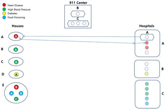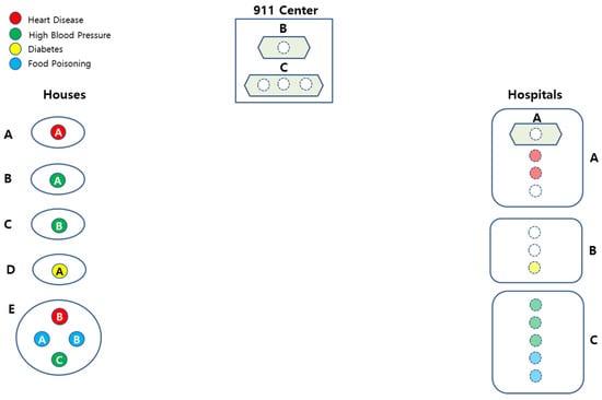 Figure 20 shows the Smart EMS Example in SAVE. The circles on the left of the figure imply the locations where patients are. Similarly, regarding the figure, the ones in the middle and the ones on the right imply the ambulances and the hospitals.