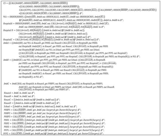Figure 21 shows the results of the simulation for the specification defined in Figure 20. During the simulation, the movements of all the processes, that is, Ambulances and Patients, along with the temporal perspective, that is, the system behaviors, are analyzed and synthesized, as shown in Figure 10. In addition, the raw data that will be used in Phase III are collected, as shown in Figure 22.