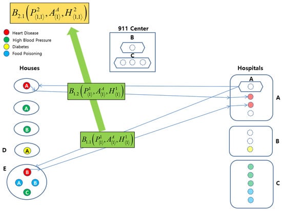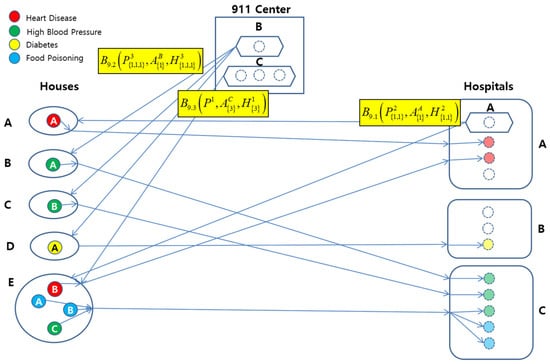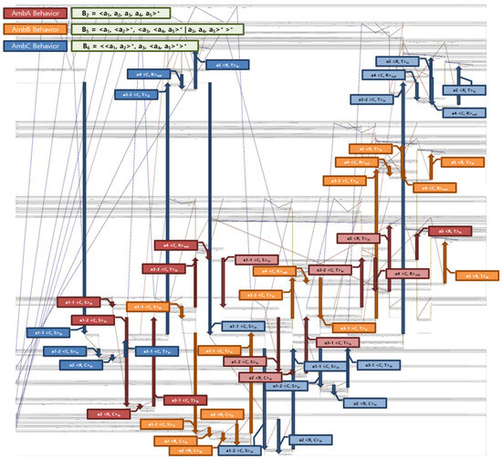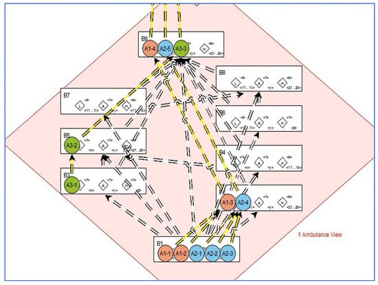 Figure 23 shows the types of abstract behaviors of the ambulances as a main class from the raw data in Figure 22. For example, the types of abstract behaviors performed by Ambulance 1 are B1, B1, B2, and B9. Figure 24 and Figure 25 show the results of projecting the abstract behaviors performed by all the ambulances onto the behavior ontology generated during Phase I.