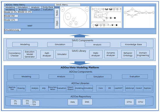 Figure 16 shows the architecture with modeling views of SAVE (Specification, Analysis, Verification, and Evaluation). SAVE is the tool suite to specify, analyze, and verify the operational and safe requirements of systems with dTP-Calculus in Section 4. SAVE was developed on the ADOxx Meta-Modeling Platform. In addition, SAVE provides the graphic notations and simulation functions for specification, analysis, and verification, based on the meta-modeling methods of ADOxx. The basic components of SAVE are as follows: