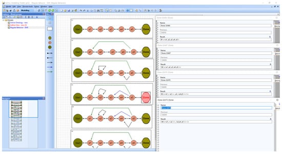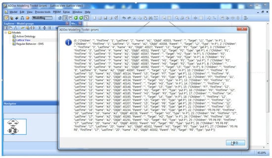 - Phase II: Behavior Instance Extraction from SAVE [6,7,11].The bottom box of Figure 2 shows the specification and simulation method for a system with dTP-calculus, which are realized on the ADOxx Meta-Modeling Platform [9] as a tool, namely, SAVE, as follows: