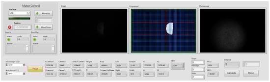 The performance of the proposed algorithm was demonstrated by fabricating a prototype model of autofocusing microscope. The proposed algorithm was integrated into a self-development human machine interface (HMI) in commercial software of LabVIEW. The LabVIEW implementation includes the following functions: for the image processing, converting to a more ideal value of output format to enhance contrast and brightness in analysis data of image processing, and using the gray morphology function to adjust the speckle shape captured by CCD1. The function “clamp” measures the side edge of the speckle including top and bottom. Finally, the program in LabVIEW also captures the centroid and gravity center of the laser spot image and executes the defocus distance calculation analysis. Figure 4 shows the photograph of the prototype model of the autofocusing microscope. Figure 5 shows the proposed HMI. As shown in Figure 5, the left, middle, and right images present the original laser spot image captured by the CCD1, processed laser spot image, and real-time image of the sample, respectively.