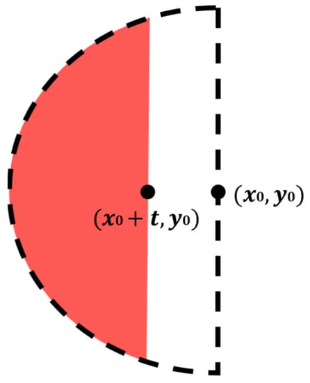 Assume that an original laser spot image captured by CCD1 is shown in the red part of Figure 7; thus the midpoint of its chord is (x0 + t, y0), the ideal semi-ellipse is the black dashed part in Figure 7, and its geometrical center is (x0, y0). Taking the geometrical center of the ellipse into Equation (1), Equation (2) can be obtained: