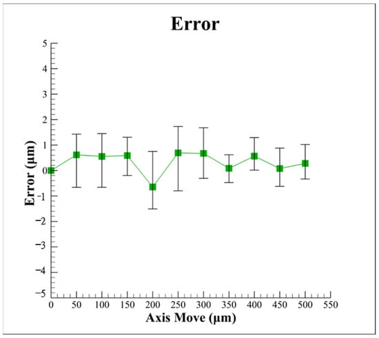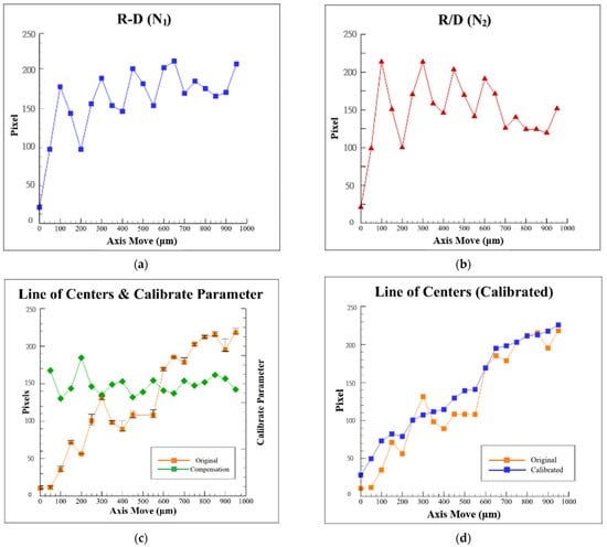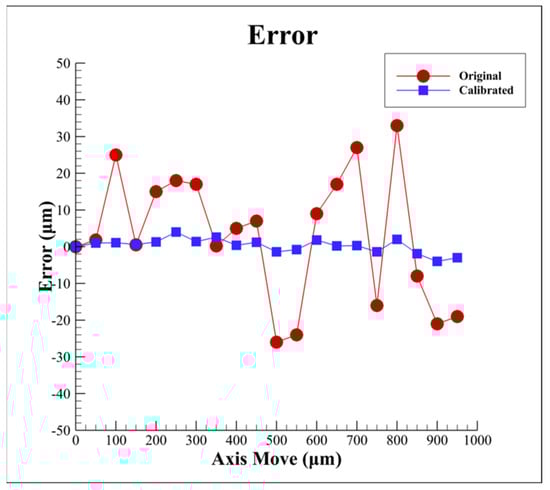 As presented in Figure 4, to demonstrate the practical feasibility of the proposed algorithm, two sets of autofocusing experiments were carried out and compared using the proposed algorithm and the original distance L method [34], respectively, with different defocus distances δ (axis move). Figure 11 presents the experimental results for the autofocusing accuracy relative to the defocus distance δ (axis move), respectively. The original experimental results which are uncompensated have large errors and variations; however, the calibrated experimental results show the absolute value of the errors is about 1.5 to 2 μm. It is obvious that the autofocusing accuracy can be improved significantly by using the proposed algorithm.