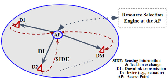 We consider the downlink (DL) of a wireless network with N independent and mobile inXSs each serving one or more devices (including sensors and actuators). The set of all inXSs in the network and the devices in the nth inXS are denoted as and , respectively. As illustrated in Figure 1, each inXS is equipped with an access point (AP) which coordinates transmissions with all associated devices. The AP is equipped with a local resource selection engine for making decisions based on local sensing data received from its associated devices via a 1-bit SIDE link, as shown in Figure 1.