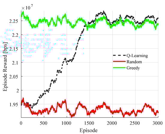 Figure 4 shows the averaged reward over successive training episodes for the joint power and channel selection problem with SINR quantization threshold, dB. The averaging is performed over all steps within each episode as well as all inXSs. We benchmark the reward with those obtained from two heuristic algorithms viz random and greedy channel selection. The maximum transmit power of −10 dBm is used for all inXSs in the heuristic algorithms. The figure shows that the proposed MAQL achieve convergence after approximately 1700 episodes. At convergence, the MAQL method has marginally better performance than the greedy selection baseline with full SI [8].