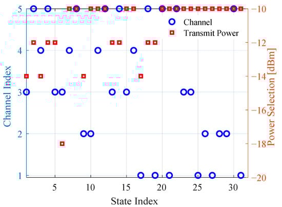 To understand the actions of the Q-agents, we show the learned Q-policy at convergence in Figure 5. The policy comprises the channel and transmit power pairs with maximum Q-value at each of the 32 () states. The figure shows that the Q-agents converge to a channel with a quantization level of 1 (i.e., with SINR ) for all states except for state 1, which has no channel in level 1. As shown in the figure, the power levels of −10 dBm, −12 dBm, −14 dBm and −18 dBm are preferred by the agents in the ratio 21:6:4:1. Two power levels, viz, dBm and dBm are never chosen with full exploitation.