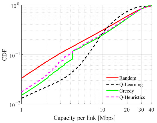 The trained Q-table is deployed at each inXS for distributed resource selection and performance compared with random, greedy channel selection and the proposed Q-Heuristic. Except for MAQL, all algorithms use the maximum transmit power of −10 dBm per transmission as mentioned above. Figure 6 shows the empirical Cumulative Distribution Function (CDF) of the achieved capacity per inXS with sensing-to-action time (i.e., sensing interval) of a single time slot. The proposed MAQL method performs significantly better than simple random selection, Q-Heuristic, and greedy selection with full SI below the 30th percentile of the capacity CDF. This performance improvement appear to have been obtained at the expense of lower capacity above the same percentile. Despite using the same information as MAQL, the Q-Heuristic method is only as good as the greedy baseline. A plausible explanation for the performance improvement by the MAQL is the combined effect of low SINR quantization threshold, , and utilization of different power levels.