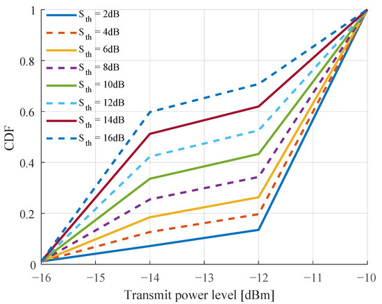 In Figure 7, we plot the 50th (median), 10th, 5th and 1/10th percentiles of the capacity per inXS with test quantization thresholds between 2 and 16 dB using the trained policy shown in Figure 5. Note that the training is performed with dB. The figure shows that high values of benefit the median of per link capacity while lower values yield higher capacity at the lower percentiles. For instance, the highest 50th, 10th and 5th percentiles of per inXS capacity are achieved with values of 12 dB, 4 dB and 2 dB, respectively. Careful consideration should therefore be taken in setting the threshold based on the communication theoretic targets of the system. In Figure 8, we evaluate the effect of on transmit power selection. The figure indicates that increasing the quantization threshold leads to a higher preference of actions with lower power levels, resulting in a decrease of about dB in the median transmit power level with a change in from 2 to 16 dB. A plausible explanation for this trend is that some of the 32 states becomes more likely with increasing (or decreasing) value of .