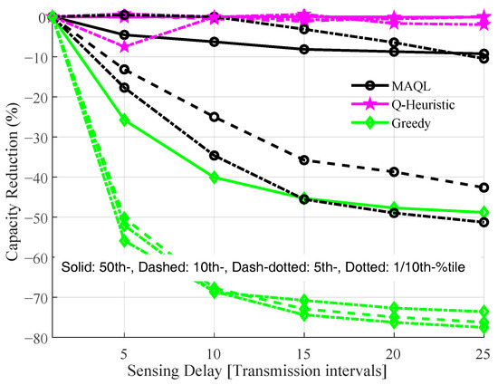 Figure 9 shows the impact of sensing interval on performance of the MAQL, Q-Heuristic and greedy schemes. In this figure, we use the achieved capacity with perfect sensing as a baseline and plot the percentage capacity reduction with increasing sensing interval. The results show that the proposed methods with 1-bit information are in general less sensitive to sensing intervals than the greedy selection method. The Q-Heuristic method exhibits the highest robustness with little or no degradation in capacity with increasing sensing interval. Compared to greedy with up to about capacity decrease, the MAQL has only degradation at a delay of 25 transmission instants. This indicates that the proposed methods offer similar or better performance as the baseline but provide significant overhead reduction for SI exchange as well as better robustness to sensing intervals which may be inevitable in practice.