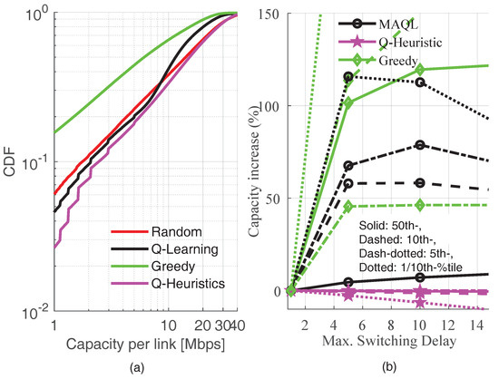 Finally, we study the effect of switching delay on the performance of the resource selection methods in Figure 10. In Figure 10a, we plot the CDF of capacity per link with maximum switching delay of a single transmission interval. As a result of the simultaneous resource switching and its associated ping-pong effects, the greedy algorithm appears to be much worse than all other methods. This indicates that fully greedy resource selection is detrimental to performance in scenarios where controlled switching is not possible. Note that the performance of the MAQL is also degraded in the region below the 30th percentile when compared to Figure 6. To further quantify the effects of switching delay, we plot the capacity increase (in percentage) as a function of the maximum switching delay. The capacity increase at a given maximum delay value is calculated by subtracting the capacity value from its value with no delay. As shown in the figure, it is indeed beneficial to minimize ping-pong effects by introducing the switching delay as stated in [9]. Except for the Q-Heuristic which appears to be quite robust to switching delay, a maximum delay of 5 transmission intervals yields capacity increase above for both MAQL and greedy selection methods. As seen in the figure, the greedy method is much more sensitive to switching delays than the proposed MAQL method, which exhibits quite marginal sensitivity at the median of achieved capacity.