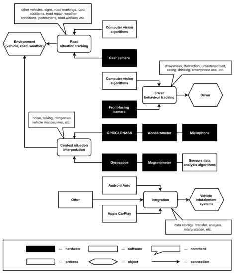 Smartphone-based driver monitoring systems are complex structures that consist of multiple interconnected hardware and software elements that are working together on different tasks. As shown in Figure 1, those tasks can be aimed at the tracking of the driver behavior, interpretation of the inner and outer vehicle environment situation as well as integration with the vehicle infotainment systems for the data storage, transfer and/or extraction as well as connection to the remote services. Note that in the context of the smartphone-based system, all the hardware elements in Figure 1 are representing built-in sensors of the smartphone. In this work, the sensors of autonomous vehicles or external sensors that can be connected to the smartphone were not considered.
