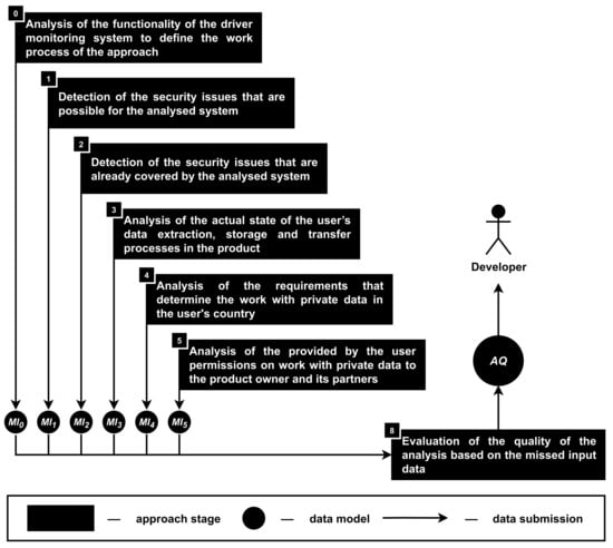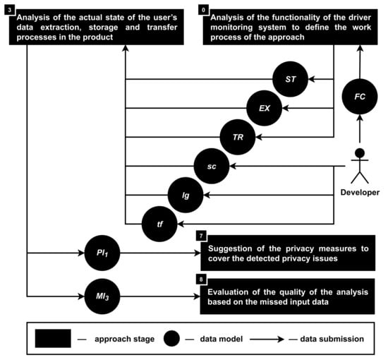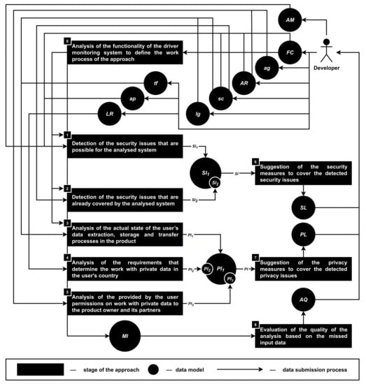 The main documents that are defining the work process with the user’s private data in smartphone-based driver monitoring systems are the agreement between the user of the system and its owner as well as requirements under the law that are described in the user’s country government documents. As a rule, the legal requirements have a higher priority, which means that the user agreement cannot violate them and must comply with these legal requirements. The goal of the analysis of those documents is to define what is allowed regarding the user’s private data, while the process of the analysis can be automated [74,75,76]. After the legal possibilities are known, they can be checked for compliance with the current state of the work with the user’s private data.