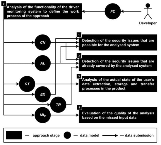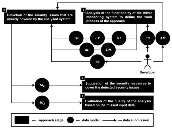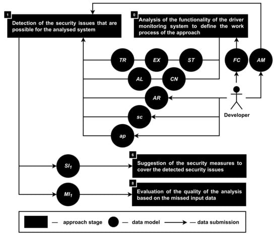 The analysis of the functionality of smartphone-based systems includes the analysis of their hardware [31] and software elements [32], interfaces [33], data transfer protocols [34], data extraction, storage and transfer processes [35], as well as their relationship with the information security threats [36]. The solution of this problem is in many ways similar to the problems that are solved by such approaches as Security by Design [37,38,39,40,41] and Secure Development Lifecycle [42,43,44,45,46]. The key difference is that such solutions perform the analysis of the functionality of ready-made systems instead of their step-by-step design. However, the task of detecting potential attack vectors to which the object of analysis may be subjected, based on the components and protection elements used by it, as well as the environment of its operation, remain similar. Note that for such approaches, it is important to analyze not only the components that are associated with the smartphone application itself but all applications, systems and services that are involved in the smartphone-based driver monitoring system—backend applications, cloud storage and services, infotainment systems, etc.