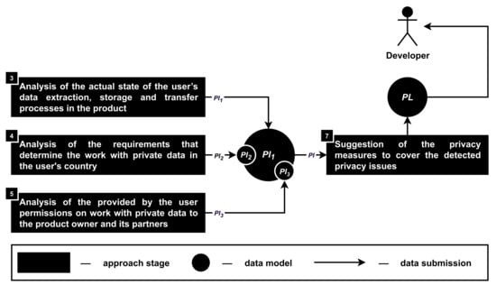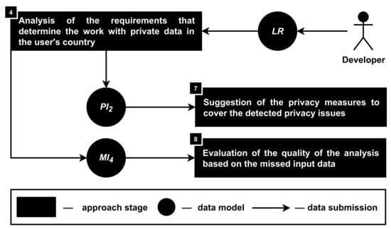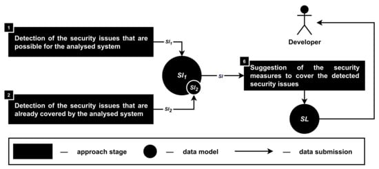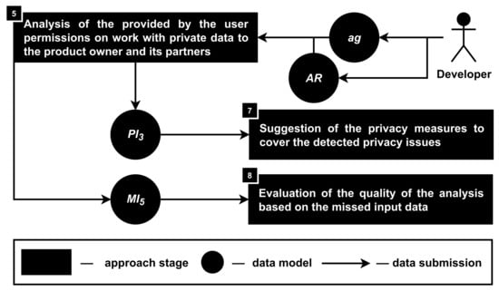 The novelty of the approach lies in the combination of multiple analysis algorithms for the automated detection of the security and privacy issues and suggestion of the solutions to them. In the developed approach, the following algorithms are working with the input data: detection of the possible and already covered security issues, analysis of the actual state of work with a user’s private data, analysis related to these data law requirements as well as analysis of user’s permissions to work with private data. Based on the output of those algorithms—detected security and privacy issues, corresponding measures are suggested to the developers with the help of additional algorithms. In addition, the developed approach can work in conditions when part of the input data are not provided by the developers. Since the lack of the input data affects the various stages of the approach in different ways, this fact is taken into account when the quality of the analysis is evaluated by another algorithm.