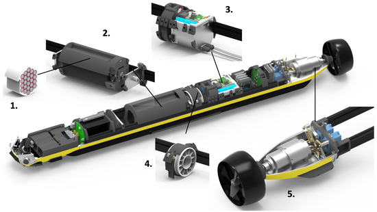 SAM AUV subsystems: 1. battery pack, 2. longitudinal center of gravity trim system (LCG), 3. variable buoyancy system (VBS), 4. transversal center of gravity system (TCG), 5. thrust vectoring system with counter-rotating propellers.