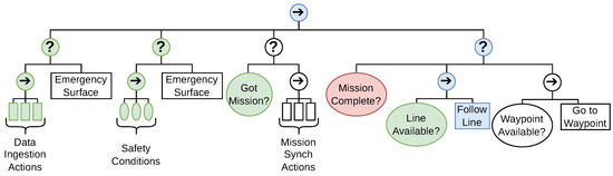 A BT is a reactive decision-making structure that is comprised of Sequences, Fallbacks, Actions, and Conditions. Each child node can return either Running, Success, or Failure to its parent. Actions and Conditions are allowed only as leaf nodes while Sequences and Fallbacks are allowed as only inner nodes. The BT operates at a fixed frequency, sending a so-called “tick” down from the root to its children. Once a “tick” is received by a leaf node, it is executed, and it returns immediately. The next child is ticked if the parent is a Sequence and it received a Success or the parent is a Fallback and it received a Failure. If a leaf node is not ticked, it does not execute or stops its execution if it was running previously. If a child returns Running, it is repeated until the root without ticking any sibling nodes along the way. The Running return state indicates that the node will take more than one tick’s time to finish and decide its return, which usually indicates a long-running action such as moving to a waypoint. Such a structure allows the designer to prioritize actions, sequence missions, and generally make sure the vehicle operates safely while keeping the overall setup modular and easy to understand [19,20]. See Figure 5 for a condensed view of the BT used on SAM.