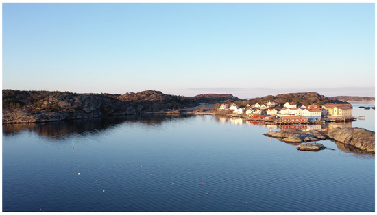Preliminary field tests were carried out at the marine field station Kristineberg on the Swedish west coast, Figure 6, where the Swedish Maritime Robotics Centre (SMaRC (https://smarc.se (accessed on 27 June 2022))) has a small seaweed test site. The testbed is equivalent to the seaweed farm built up in the simulator described in this paper and consists of two lines of seaweed ropes attached to supporting buoys at the surface and anchored to the sea bed by concrete blocks. The farm is approximately 15 by 15 m and the ropes are situated at about 2 m depth. Here we have been able to test the rope detection scenario in a real setting so that the algorithms we are developing are trained and tested on real data. Data have been collected during a number of visits to the farm in different conditions during the year April, June, and November).