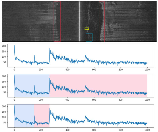 (Top): A sidescan sonar “waterfall image” of parts of the seaweed farm. (Three bottom plots): The red, blue, and yellow annotations correspond to the nadir, rope, and buoy signals, respectively. The three graphs show the port sidescan sonar signal (a row of the top image) and the corresponding nadir and rope segmentation results.