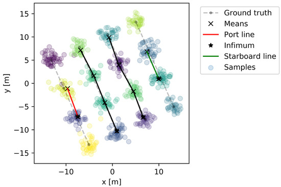 To handle potential misdetections of buoys, the raw detection results described in Section 5 are fed into a variational Gaussian mixture model (VGMM). The VGMM is instantiated with a maximum amount of classes equal to the number of buoys in the farm, allowing it to cluster buoy detections and be robust against outliers. Once the buoys have been detected sufficiently often to give reasonable confidence in their relative locations, we do a piece-wise linear fit through the buoys such that the resulting lines must align with the a priori known farm orientation (compass direction). A depiction of this line fit is given in Figure 8. The results from this VGMM line fit serve as an updated seaweed farm map and are used to position the AUV for more close-up seaweed row inspections.