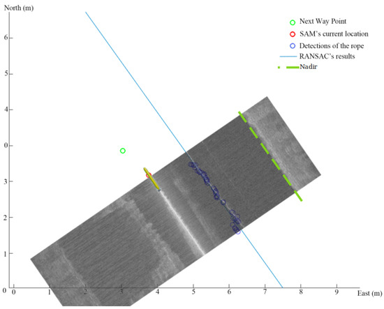 The ropes that the seaweed hangs from do not lie perfectly straight. In order to hold the AUV at the proper distance for visual inspection, a line following control behavior was used. The idea is to use the last few detections of the rope to project a straight line and then to control the vehicle to a path offset from that by an appropriate amount. This is similar to a wall following the behavior of an indoor robot navigating a corridor. After moving along the initial route long enough to collect some detections of the rope, a random sample consensus (RANSAC) regressor [23] is used to find the inliers and fit a straight line to them, Figure 9.