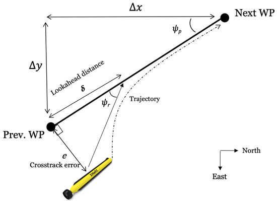 The line-of-sight guidance law considers a lookahead distance , the crosstrack error e, and the intercepts between waypoints and . This ensures the AUV follows the straight line between waypoints as much as possible by minimizing cross-track error.