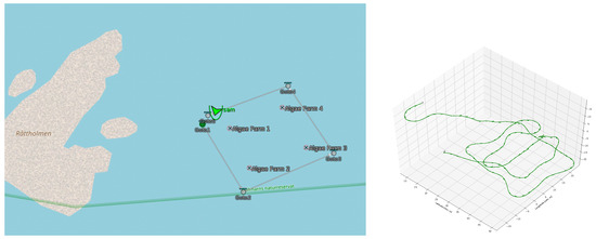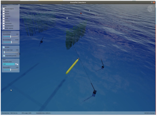 The test site for the seaweed farm at the marine field station Kristineberg (https://kristinebergcenter.com (accessed on 27 June 2022)) is built up in a mission simulator (https://github.com/smarc-project/smarc_stonefish_sims (accessed on 27 June 2022)) using the open source Stonefish simulation tool [18]. The test site simulation is divided into two parts, one being the numerical model of the bathymetry around the Kristineberg field station and the other being the small seaweed farm model. The seaweeds in the simulation are modeled as warped, elongated rectangles. Figure 11 gives a close-up view of the seaweed farm, as well as the AUV operating underwater during a seaweed row inspection behavior. An integrated view of the two aforementioned pieces (the field station and the seaweed farm), together with the AUV model, is shown in Figure 12.
