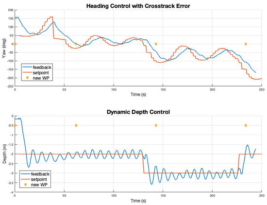 The top plot shows how our PID control follows a yaw command in the simulation while the bottom shows depth control. The orange plots show the set point sent to the actuation controller while the blue is the estimated values used for the feedback to the set-point PID controller. The yaw set-point is computed using the presented LOS guidance law based on cross-track error. The gold stars show points where the way-point from the planner changed.
