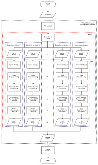Then, a new DataFrame that has a column resulting from the motif discovery process will be exported into a folder containing .csv. The resulting DataFrame that was previously split into several partitions will be combined first using the resulting file, and will be saved into the HDFS because the data will still be divided into several block files in different nodes. Once saved to the HDFS, the resulting folder is copied back into the virtual machine environment on the Google Cloud Platform. In this environment, the data are back to normal in the form of a regular .csv and the file is not broken into several parts in the local machine. The last step is to download the processed folder from the virtual machine to a personal computer.