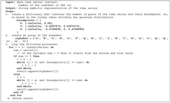 The first stage conducted in the Apache Spark environment is data preprocessing. Before completing the processing and calculations, we need to clean the data first. At this stage, preprocessing of the time series data input is carried out. This preprocessing is the stage of cleaning the raw data. After that, the next stage is the data normalization stage. The time series data are normalized using Z-score normalization so that all data are comparable for processing. The reason for using this normalization is because time series data tends to have data with a normal distribution [18]. The normalized time series data will then be converted into SAX and generate string data to be processed by the motif discovery random projection algorithm. The SAX method allows time series data to be converted into a string with the desired number of characters or alphabets in the string. The size of the alphabet is an arbitrary integer a, where a > 2. This algorithm consists of 2 steps: (i) the transformation of the initial time series into a time series with Piecewise Constant Model (PAA) representation [19]; and (ii) reducing the dimensions by converting PAA into a symbolic representation of the time series in the form of a string [20]. The process of the SAX algorithm is described in pseudocode in Figure 2 and an example of the results of the time series discretization is shown in Figure 3.