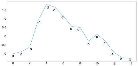 Time series that have been discretized to be labels of SAX in the following string “aabddddccbcbaaa”.