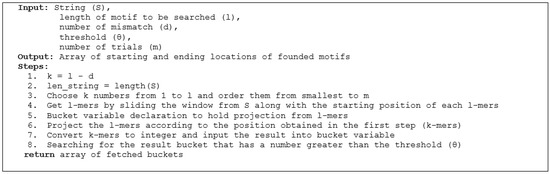 - Ashraf, F.B.; Abir, A.I.; Salekin, M.S.; Mottalib, M.A. RPPMD (Randomly Projected Possible Motif Discovery): An Efficient Bucketing Method for Finding DNA Planted Motif. In Proceedings of the 2017 International Conference on Electrical. Computer and Communication Engineering (ECCE), Cox’s Bazar, Bangladesh, 16–18 February 2017; IEEE: New York, NY, USA, 2017; pp. 509–513. [Google Scholar]