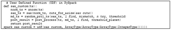 The UDF’s role is to run the commands it contains against all RDD data frame partitions that Apache Spark has split. For example, DataFrame x has 10 data divided into 4 partitions split by Apache Spark. Then, when the UDF, which contains data normalization, the SAX algorithm, random projection, and preprocessing, is executed, the three functions are executed simultaneously to each partition. To declare this UDF function requires a data type structure for the output of this function, namely an array in an array containing an array of integers which will contain the motif’s start location, the motif’s ending location, and a 1:1 resonance condition of the motif. The application of the UDF function and the modification of the algorithm are shown in Figure 5. It can be seen that, basically, the UDF program involves the following functions: Z-score normalization, SAX, random projection, and postprocessing.
