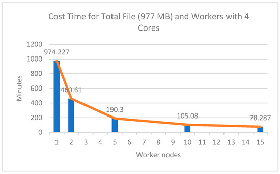 The experimental results of the four cores with several worker nodes showed a significant comparison of computing time, as shown in Figure 7. From Figure 7 and Table 6, it can be seen that the more workers used in the cluster the faster the computing process was. This shows that the number of nodes used significantly affected the computational speed. The longest time taken for processing data was on the 977 MB file, which was 974.23 min or equivalent to 16.23 h using 1 worker node, while the fastest time was 78.28 min or equivalent to 1.3 h using 15 workers nodes, which had a speedup value of 12.4 times faster than using 1 worker node.