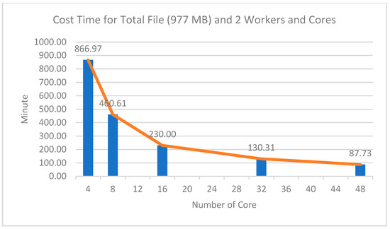 The results of the first experiment can be seen in Table 7. The ‘Cost Time’ column shows the amount of time to complete each computation in minutes for all files. The ‘Speedup’ column is the performance measure. This column measures the ratio of execution time and execution time on a cluster-per-four-cores basis. Then, the ‘Efficiency’ column is a measure of the use of computing resources. It measures the ratio between performance and the resources used to achieve that performance.