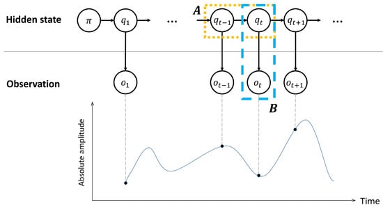 In the HMM framework, optimal probability models (also, referred to as optimal parameters) are obtained with best explaining the observations by the Baum–Welch algorithm in HMM [17] (). Then, the hidden states are revealed by the Viterbi algorithm, which uses the estimated parameters with observations as follows [18,19]: . From the perspective of detection, the SOIs are identified by samples possessing the “signal” state.