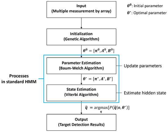 Block diagram of detection process in hidden Markov model (HMM). Multiple measurements were exploited to determine the best initial values for the HMM parameters using the genetic algorithm. They were updated with the Baum–Welch algorithm using the multiple measurements. Then, hidden states of the multiple measurements were revealed via the Viterbi algorithm using the HMM parameters.