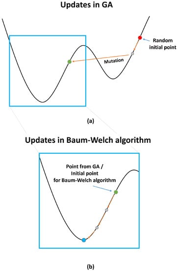 Parameters in HMM evaluated via sequential usage of GA and Baum–Welch algorithm: (a) GA yielded unbiased initial point for Baum–Welch algorithm in subsequent stage; (b) Baum–Welch algorithm yielded global optimal point from unbiased initial point.
