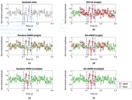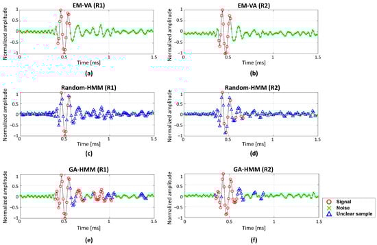 Figure 8 shows the detection results from the EM-VA, the multiple-measurement Random-HMM, and the multiple-measurement GA-HMM. While the EM-VA was applied to the measurements individually, the Random-HMM and GA-HMM detected the SOIs after the shared parameters over the measurements were estimated. In the EM-VA, k-means and pre-grouping were applied to evaluate the initial values, and obtain a consistent detection result for the same data. However, although the GA-HMM is less affected by the random initial value used in GA, the detection of the GA- and Random-HMM varies depending on the trials, even if the same data are used. Hence, the Random–HMM and GA-HMM were applied to the measurements repeatedly, and the average of 100 detection results were used. The value for the state of a certain sample in the measurements was between 0 and 1, and a sample with a higher (or lower) number was likely to be the signal (or noise). In this study, samples exhibiting values exceeding 0.7 and less than 0.3 were classified as “signal” and “noise”, respectively. The remaining samples exhibiting values between 0.3 and 0.7 were neither “signal” nor “noise” and were referred to as “unclear samples”.