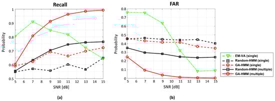 To investigate the detection performance of the schemes for various noise magnitudes, synthetic data with various SNRs were generated. The recalls and FARs from schemes were displayed according to the SNRs, as in Figure 5, where they were averaged over 100 trials at each SNR. At low SNR, EM-VA had high recall and FAR, and most of samples were identified as “signal”. With the increment in the SNR, the false alarm significantly reduced with lower recall by overlooking SOI samples more frequently. The other schemes using single measurement resulted in increased recalls and decreased FARs as the SNR increased. In particular, the initial point obtained using the GA improved the single-measurement performance, which also improved as the SNR increased. The schemes based on single measurement could not provide reliable detections (even at high SNRs) because of their insufficient recalls (EM-VA and Random-HMM) or high FARs (GA-HMM and Random-HMM). As shown previously in Figure 4, the multiple measurements improved the detection performance by evaluating the conditional probabilities in (7)–(9) more confidently. The recall (or FAR) of the multiple-measurement Random-HMM improved gradually as the SNR increased and reached 0.75 (or approximately 0.2) at a high SNR of 13. The detection performance improved considerably by the multiple-measurement GA-HMM, whose classification accuracy was accelerated by the increase in the SNR and became almost perfect at the appropriate SNR. Additional methods for obtaining fine initial points such as the GA are important in HMM-based detection because the initial points significantly affect the parameter estimation in the Baum–Welch algorithm of HMM.