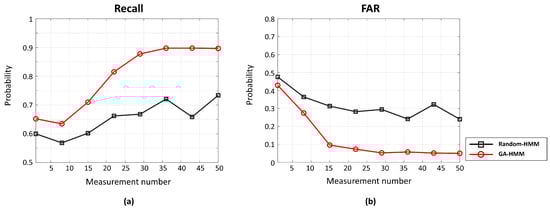 The multiple-measurement Random-HMM exhibited improved performance in terms of both recall and FAR (moderate recall with significantly reduced FAR) because it exploited the consistency of the SOI in the multiple measurements when updating the parameters and was less affected by erratic noise. Detection performance was significantly improved by using multiple measurements to determine better initial points with GA and update parameters with the Baum–Welch algorithm. As a result, the multiple-measurement GA-HMM exhibited the highest recall and lowest FAR, indicating that most of the samples were identified correctly.