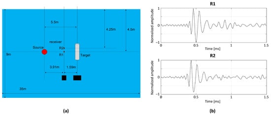 An experiment for target scattering was conducted in a water tank with size of 35 m (length) × 20 m (width) × 9 m (depth). A simple illustration of the water tank is shown in Figure 7a, and its details are provided comprehensively in [27]. A 1 s long linear frequency-modulated pulse signal with a bandwidth between 0.5 and 25 kHz from a transducer impinged on the cylindrical shell target, and the scattered signal from the target was measured using two hydrophones at different water depths (referred to as R1 and R2). After applying a matched filter to the measured signals (pulse compression), a specific time period of 1.5 ms, including the returns from the target (intense specular echo and two subsequent weak elastic surface waves) was selected, as illustrated in Figure 7b, and the corresponding observation size T was 150, with a sampling frequency of 100 kHz.