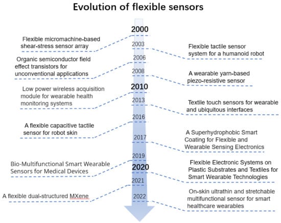 Since the late 1990s, smart wearables have been developed in various ways. More user-friendly and human-centered designs have been developed, such as diverse research on physical factors such as comfort, usability, ergonomics, and wearer design, and smart wearables have been developed in all aspects and are widely used in areas such as electronic skin, health monitoring, sports monitoring, smart medicine, and human–computer interaction. In 2000, Jiang et al. [15] proposed a new microfabrication technique that has been developed and applied to the development of flexible shear–stress sensor arrays. In 2003, Kerpa et al. [16] proposed the development of a flexible tactile sensor system for humanoid robots. In 2006, Manunza et al. [17] fabricated the first fully flexible field effect device for chemical detection based on organic field-effect transistors, which opened the way for the production of flexible chemical and strain sensors. A wearable yarn-based piezoresistive sensor was put forward by Huang et al. in 2008 [18], demonstrating the feasibility of a yarn-based sensor, and the results showed that the yarn-based sensor could accurately track breathing signals. In 2010, Figueiredo et al. [19] developed a low-power wireless acquisition module that does not require the preparation of electrolyte gels, and it provides continuous monitoring of the user’s electrocardiogram (ECG) and activity. The design of textile touch sensing interaction was explored by Roh et al. [20] in 2013 with the new metal composite embroidery yarns (MCEYs) and a simple and easy fabrication technique. In 2016, Ji et al. [21] presented a flexible capacitive tactile sensor for robot skin, and a tactile feedback and signal acquisition system was built for the application of robotic obstacle avoidance. In 2017, Li et al. first fabricated [22] a highly flexible multifunctional smart coating using spray-coating multiwalled carbon nanotubes dispersed in a thermoplastic elastomer solution, followed by treatment with ethanol. In 2019, Wang et al. [23] comprehensively summarized a comprehensive review of the latest progress concerning smart wearable sensors, with a focus on bio-multifunctional (biocompatible, biodegradable, and self-healing) device designs. In 2020, Baeg et al. [24] summarized recent progresses in flexible electronic systems, composed of transistor-based circuitry and active matrices built on plastic or textile substrates. In 2021, Guo et al. [25] developed the design and production of dual microstructures of surface micro-bumps and internal hollow pores in the conductive material, MXene, to obtain a multifunctional high-performance pressure sensor, showing an ultra-sensitive ability to extract gesture behavioral information and physiological information from the sensor signals, and its implications for human health. In 2022, Zhang et al. [26] developed an on-skin ultrathin and stretchable multifunctional sensor for smart medical wearables that paves a promising path for future wearables for smart skin and healthcare applications. The above discussion briefly outlines the timeline of major milestones in the development of flexible sensors in the smart wearable field (Figure 1).