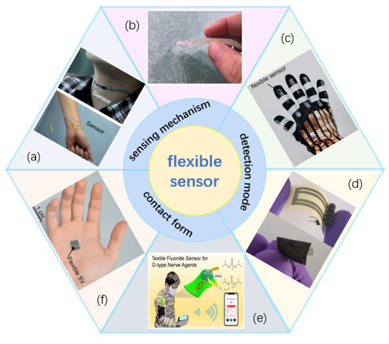 Flexible sensors based on different sensing mechanisms, detected objects, and contact forms: (a) a resistive strain sensor attached to the skin [31]; (b) a wearable triboelectric sensor for a dynamic prosthetic fit [32]; (c) a highly stretchable, tough, and sensitive strain sensor [33]; (d) organic chemical sensors for the detection of chemically corrosive vapors [34]; (e) contact sensors for bio-detection of flexographically printed fabrics made of fluorine-containing G-type nerve agents [35]; and (f) a non-contact sensor for a physiological monitoring system based on the wearer’s palm [36].
