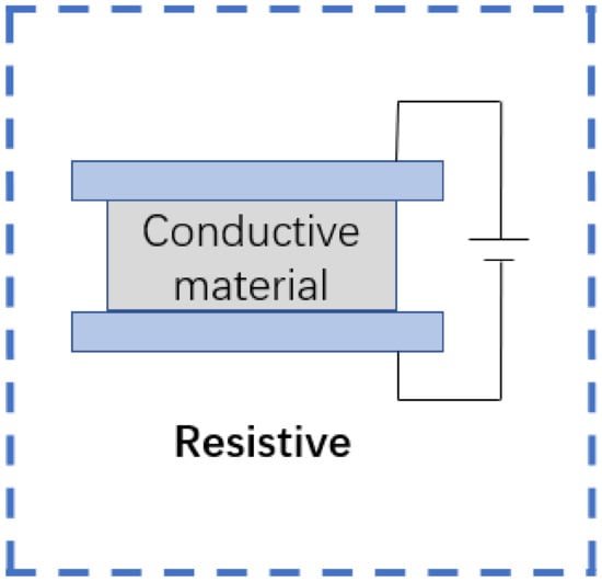 A flexible resistive sensor is a device that converts external pressure values into resistance or current values. In accordance with the different sensory mechanisms of the device, it can be defined as a piezoresistive or strain type. For flexible piezoresistive sensors, when subjected to external pressure, the conductivity of the conductor material is changed with some small changes in itself [23], i.e., the piezoresistive effect. By the same token, when flexible strain sensors are stretched or compressed by external pressure (that is, when mechanical deformation occurs), the cross-sectional area of the conductor changes, resulting in a corresponding change in the conductive area and thus the recorded resistance [37]. Figure 3 is a schematic diagram of the signal conversion mechanism of a resistive flexible sensor.