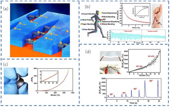 Application of the strain-based flexible sensor in smart wearables: (a) a schematic diagram of electron transport at the crack edge in a crack-flexible strain sensor [43]; (b) a wearable graphene fabric strain sensor for the detection of various human motions [44]; (c) injection of graphene nano-powders into transparent adhesive pads to fabricate flexible strain sensors with an excellent tensile–strain response [45]; and (d) the sensory performance in response to the bending of the finger and the degree thereof are both reflected in the relative rate of change in the resistance [46].